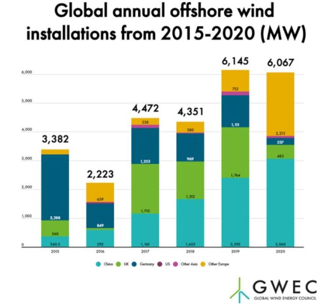 據全球風能理事會GWEC(Globle Wind Energy,GWEC)最新報告,2020年,全球新增海上風電裝機容量的一半來自中國。 絲路中心(BRICC)觀察到,海上風電已是全球能源投資的熱點產業。目前海上風電發展目前是什么態勢?全球資源情況如何?今后將如何發展?我們應該采取什么策略? 本篇文章,絲路中心(BRICC)根據公開資料對以上問題進行分析,并提出相應的工作建議。 文章要點 •全球海上風電發展呈現進入爆發期。后續還會有越來越多的國家出臺支持政策,發展還將加快。中國連續三年海上風電新增裝機量處于世界領先地位,2020年新增海上風電裝機量超過3GW,占全球增量一半以上。 •中國近年已經成為全球海上風電發展的領頭羊,今后還將繼續加大力度。歐洲國家,韓國、越南等亞洲國家也在持續發力。 •全球海上風電具有巨大的發展空間。隨著單機容量不斷增大、制造和安裝成本的持續下降,海上風電將越來越具備商業競爭價值。 •在一些海上風電資源豐富的國家,在其政策將明未明之時,及時搶占資源好的風電場并連續開發,是當前海外電力投資的重要方向。 •未來提高競爭力,海上風電+儲能、海上風電+制氫等模式,也是應該考慮的可持續發展模式。 1 中國海上風電行業進入爆發期 根據全球風能理事會(Global Wind Energy Council,GWEC)發布的最新數據顯示,2020年全球海上風電新增裝機量超過6GW,盡管受到新冠疫情影響,但風電發展在能源行業中保持良好勢頭,成為有史以來第二好的年份,詳見圖1、表1。 總體而言,目前全球海上風電裝機總容量已超過35GW,在過去5年中增長了106%,詳見圖2、表2。