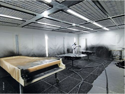 早在 30 年前就與貝森朵夫有過合作的 Berkmann Lackieranlagen 公司再次接受委托,建造新的車間。“但新噴漆車間的工藝流程基于全新的設計方案。”銷售&技術總監 Rainer Berkmann 解釋道。內部裝有通風裝置、過濾系統以及熱回收和發電系統的設備控制中心,與工廠廠房分開安置在一棟建筑物內。這樣就可以在噴漆作業區設立寬敞的工位,以及準備工位和烘干室。油漆存放和準備區也被整合到車間整體設計方案中。